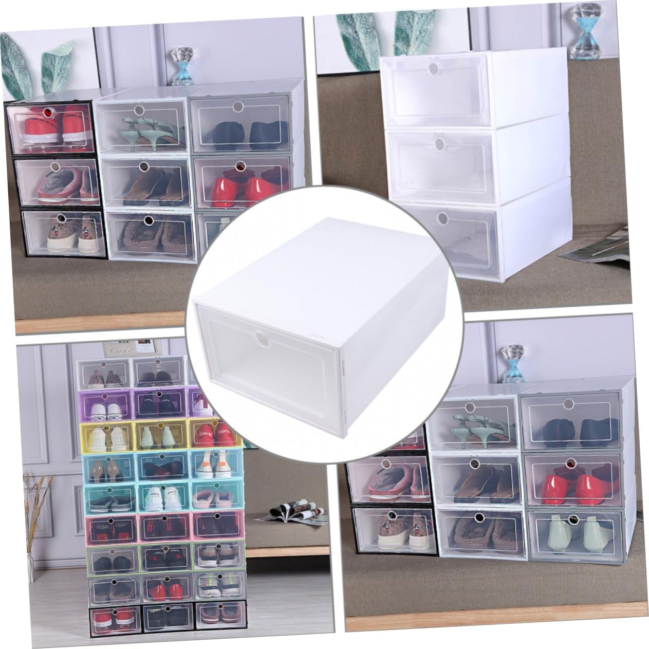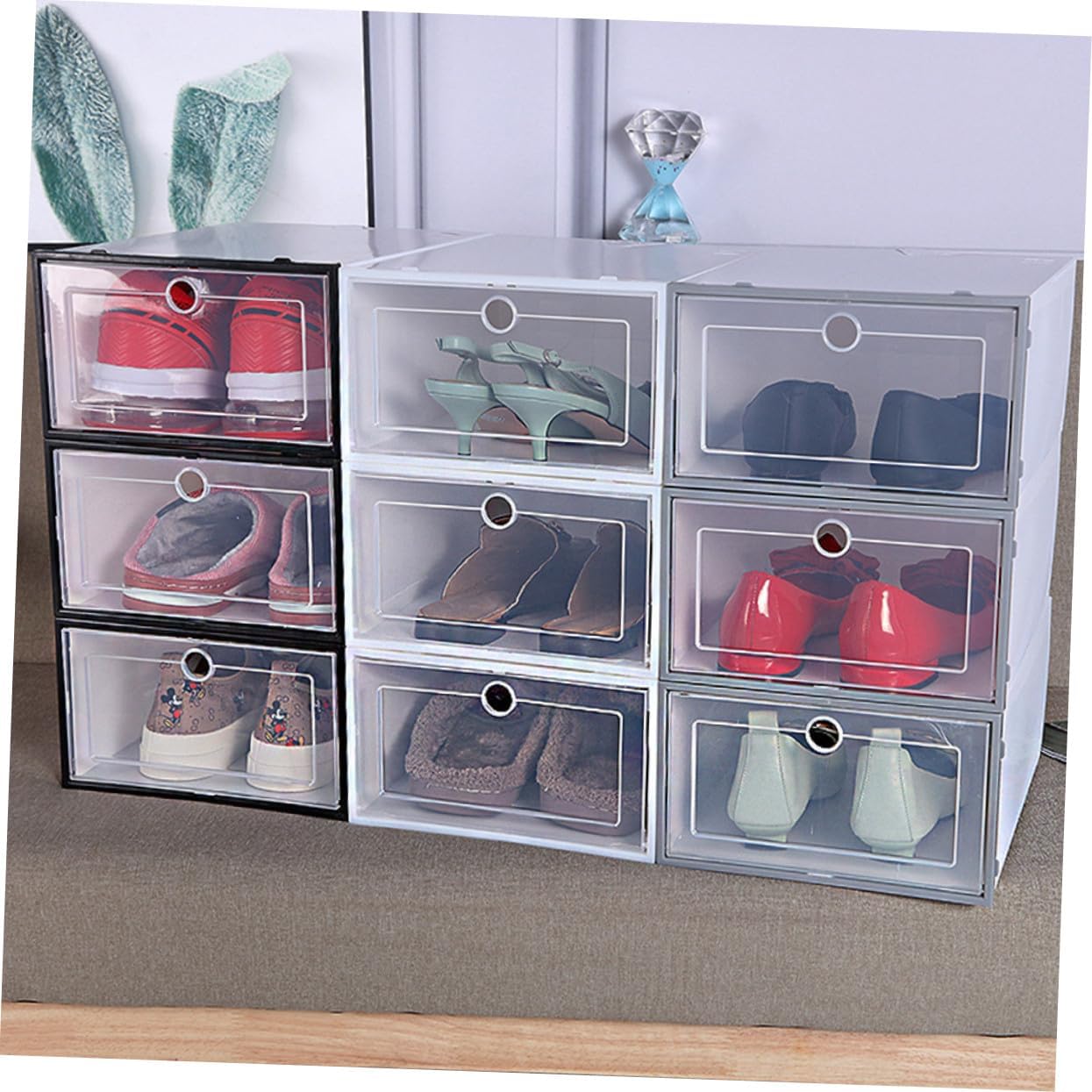 Package Include 6 x shoes box Features - Material: Plastic shoe storage boxes. - Size: 33.00X24.00X14.00cm/12.97X9.43X5.50in stackable shoe storage. -Product Info:Shoe box - Drawer type drawing design, easy to use shoe storage bins. - These boxes will help you find your shoes easily and save time shoe storage organizer. - Superimposed, convenient storage; the upper layer can be superimposed to save space clear shoe storage boxes. - Its material is plastic, environmental protection material, reinforced cabinet design, thick and strong bearing capacity stackable shoe boxes. - It is stackable, which will save your space, organize your home transparent shoe boxes.Goods Descriptionshoe storage boxes Good shoes take you to good places and yours deserve the best care possible.stackable shoe bins Our shoe storage box is a must-have closet organizer to ensure your shoes look just like when you first fall with them.clear shoe boxes with lids The shoes storage box is stackable, shoe box for closets, entryway, under clothing rack, bed, storage cabinet or where ever you desire