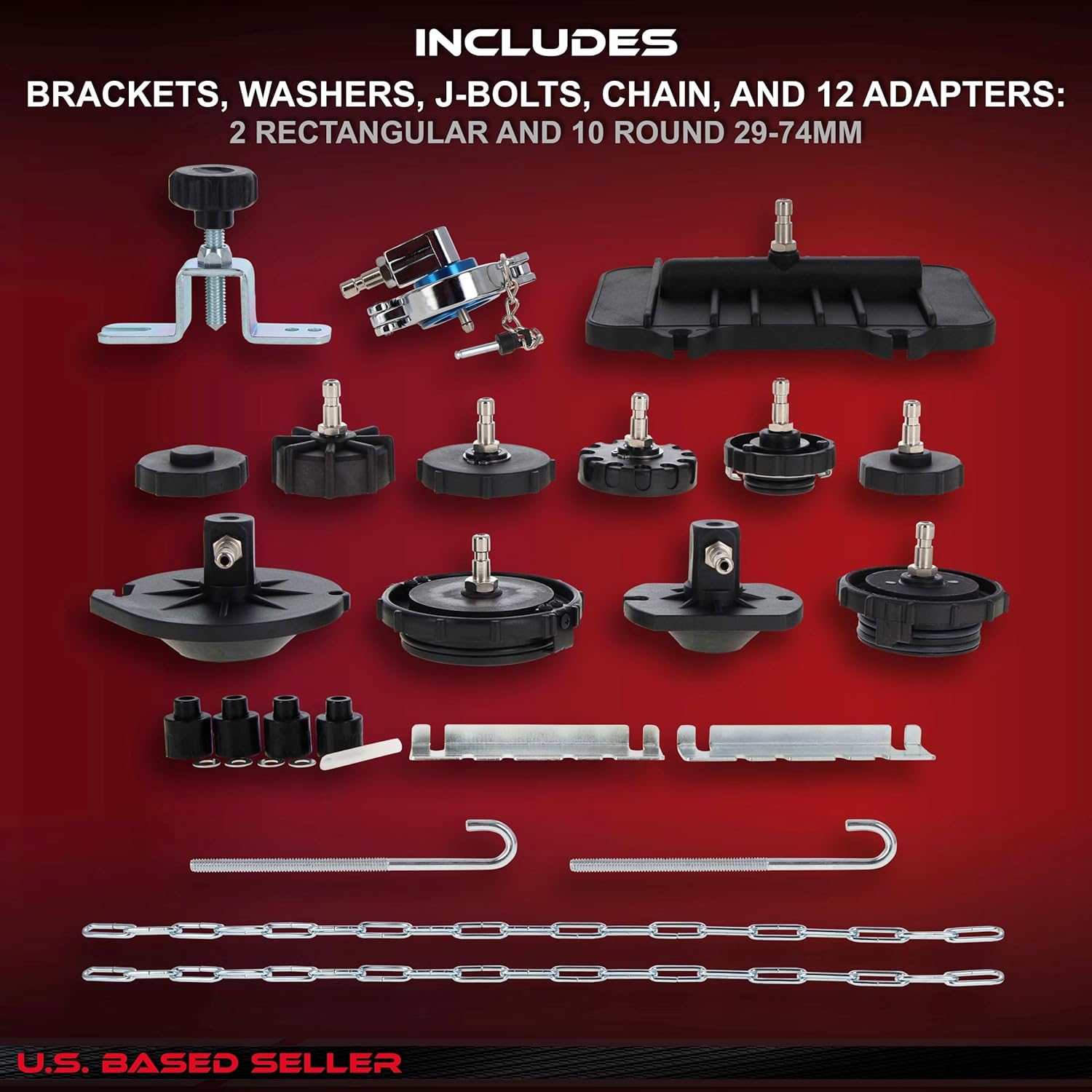 • [Contents]: Master brake bleeder kit has 12 adapters (1 rectangular for Chrysler/GM, 1 for Toyota/Lexus, 10 round 29-74mm ID); 90-degree universal adapter for difficult areas; Also includes brackets, washers, J-bolts, chain