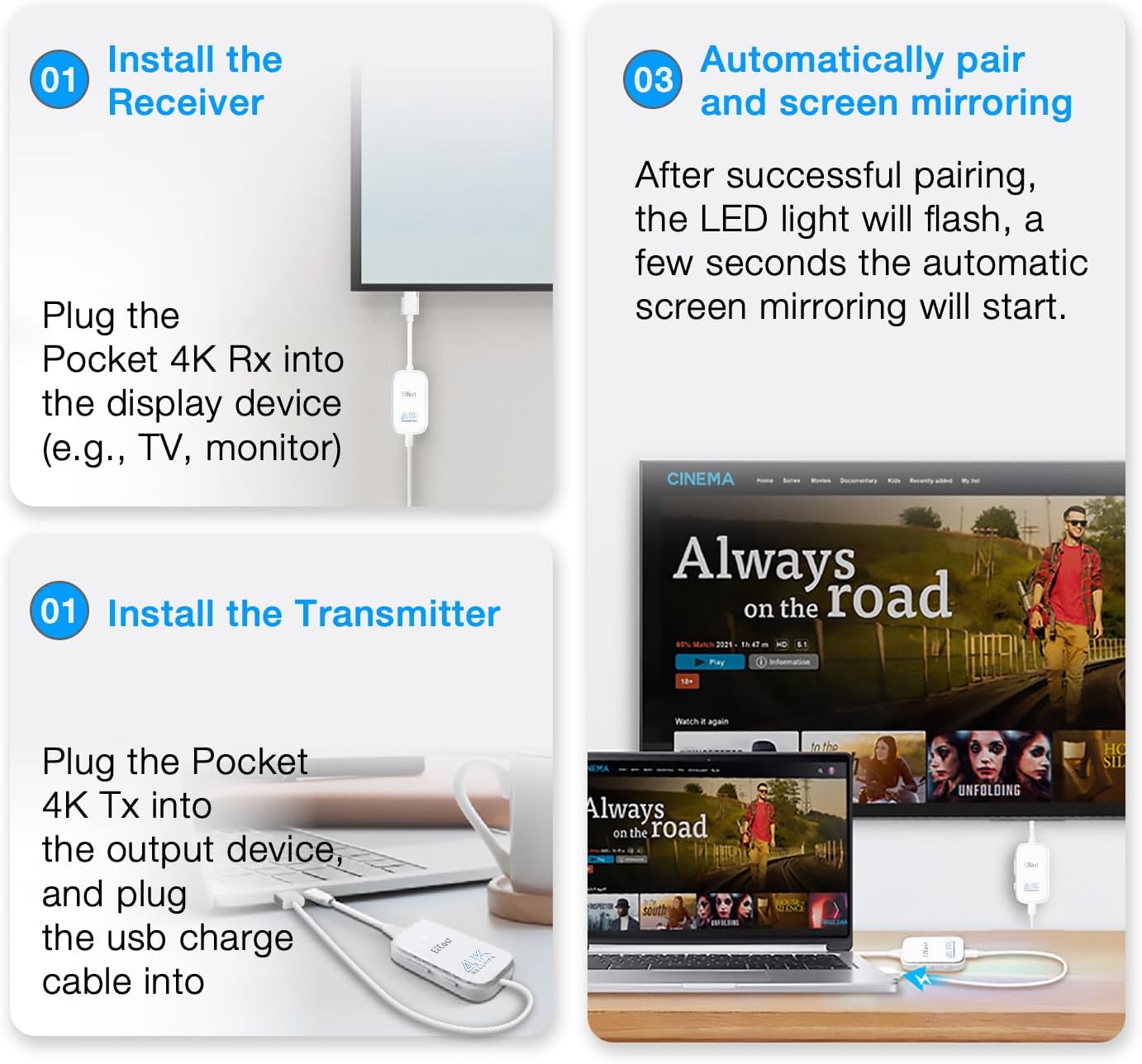 EZCast Pocket 4K is a compact wireless HDMI display adapter that mirrors your phone, laptop, or tablet to any TV or projector in crisp 4K. Supports USB-C and HDMI transmitters for wide device compatibility. Ideal for home entertainment, presentations, and travel, offering stable wireless streaming without cables.